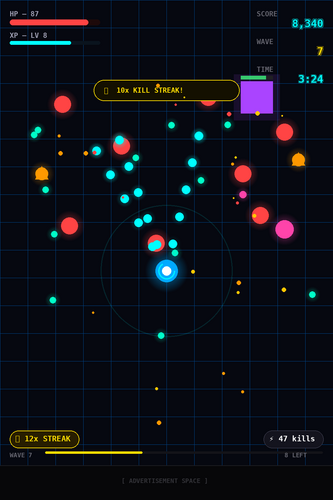 | Tags | Auto Battler, Bullet Hell, Casual, free, mobile-friendly, Neon, Roguelike, wave-survival |
