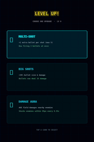 - On level up, choose 1 of 3 upgrades to power up your build